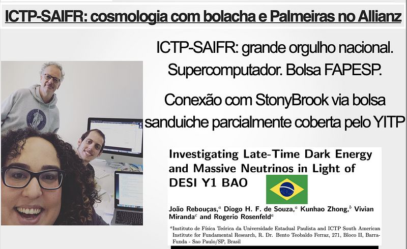 Such excellent collaboration allowed me to mentor two strong and dedicated Ph.D. students: João Rebouças and Diogo Henrique (now a postdoc at JPL). Applying to ICTP-SAIFR and working with Prof. Rosenfeld is the best path to collaborate with me without leaving Brazil. Such collaboration can include long-term visits to SBU (via FAPESP-BEPE).